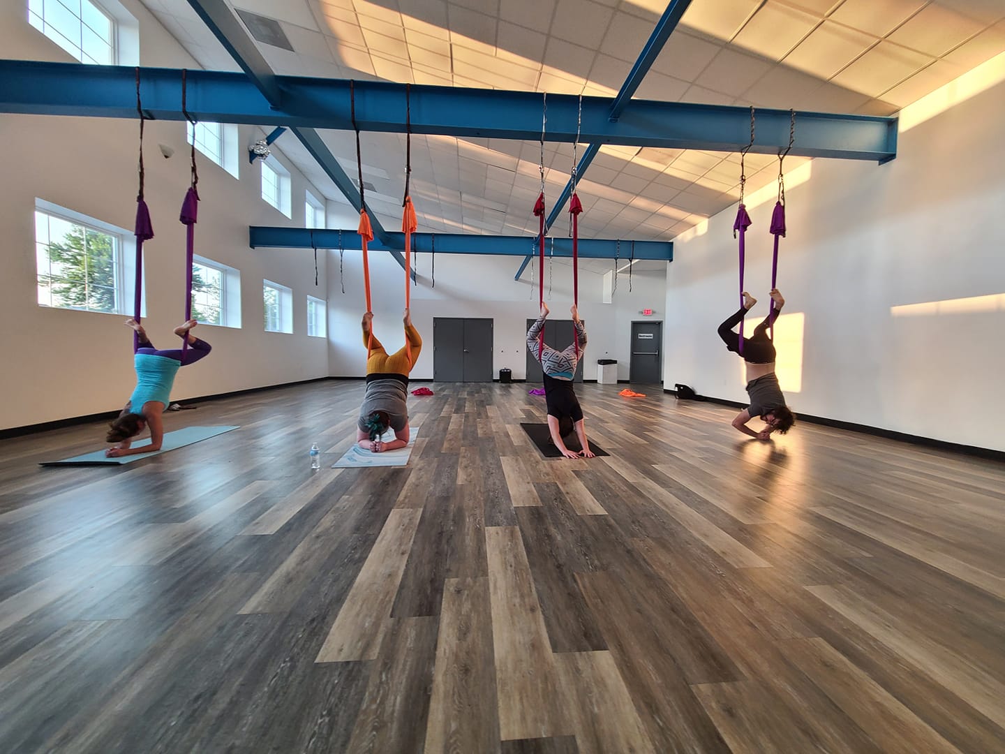 This aerial fitness class uses suspended hammock apparatus to utilize the concepts of aerial yoga to assist in increasing flexibility and strength throughout the whole body. Class starts with soothing sound bowl meditation, and eases into a wonderful stretching flow experience with some strength training to tone & lengthen the muscles. Some guided inversions will occur. $22/person.