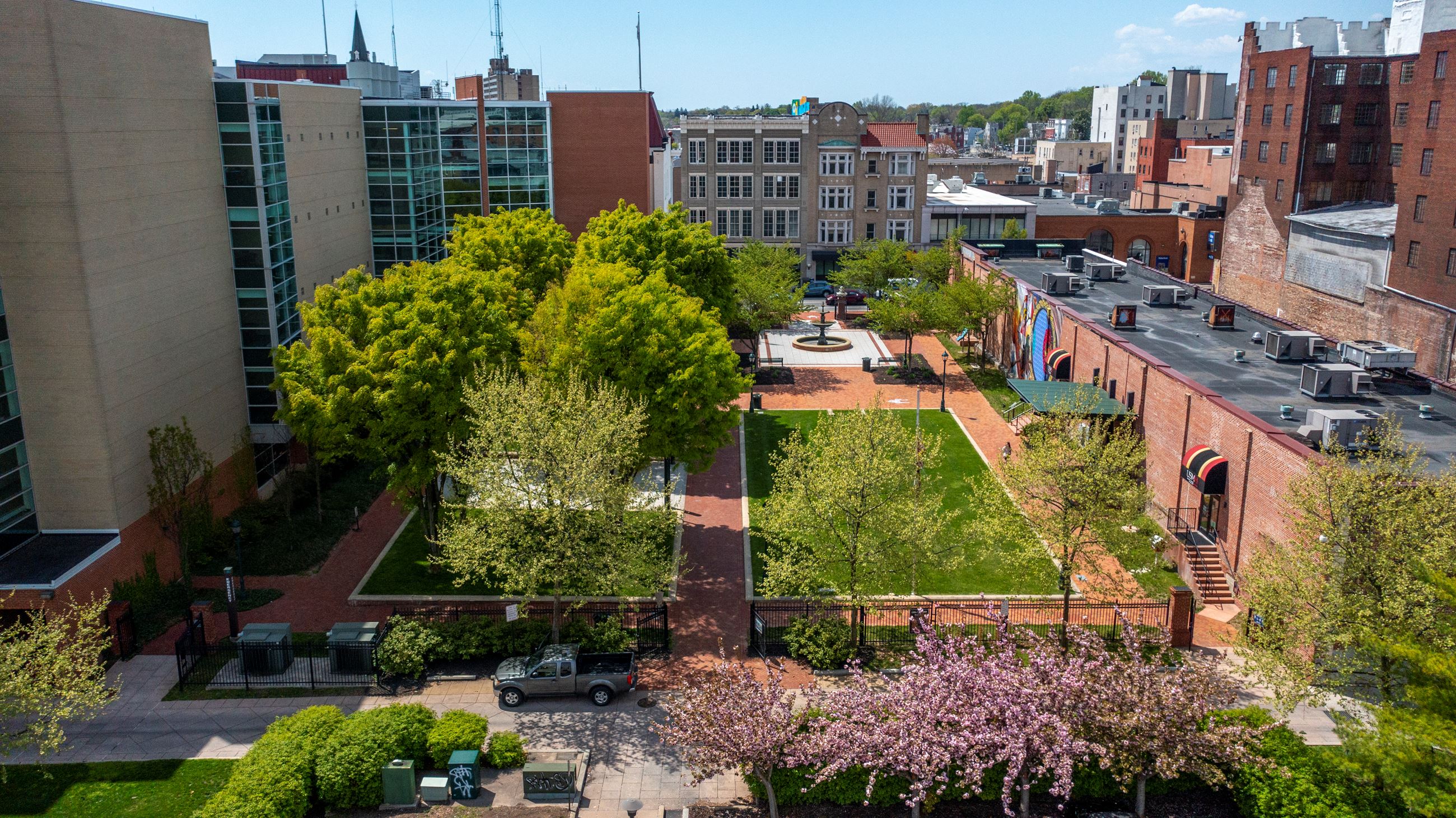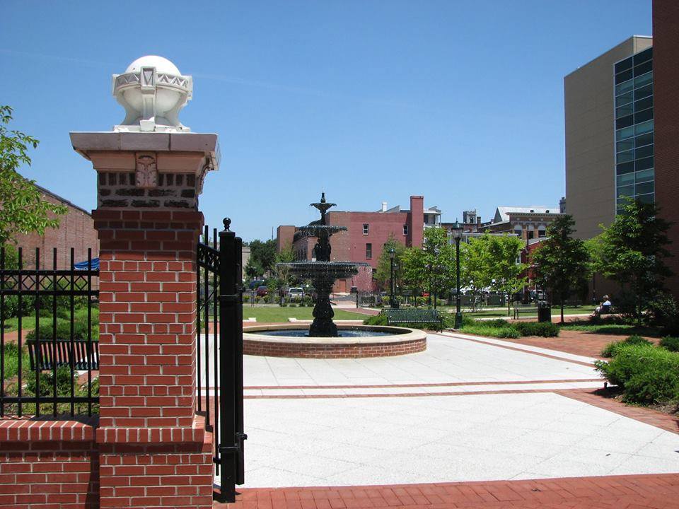 Located at 50 W. Washington St In downtown Hagerstown, University Plaza is an urban pocket park with amenities that include a small stage, electricity, lawns, paved areas, benches, tree s, a fountain, public art, and restrooms. It is fenced with access from both Washington Street and Wareham Alley. The University Plaza does not have a pavilion or picnic tables.